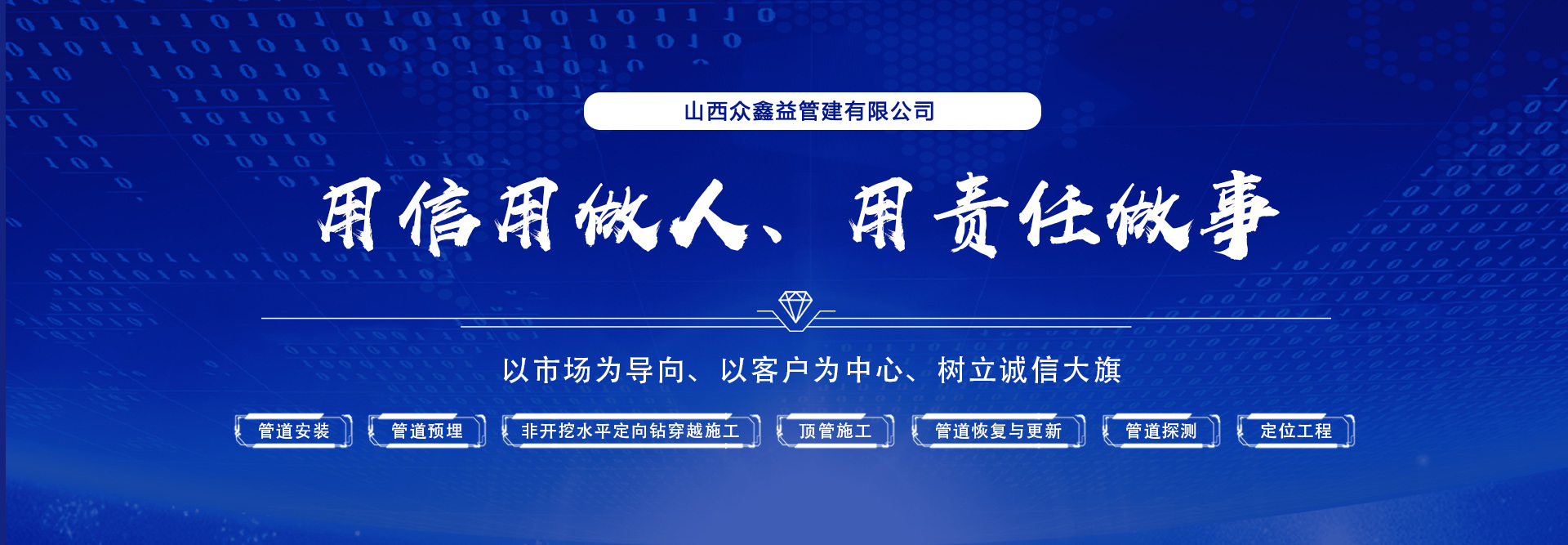 山西眾鑫益管建有限公司成立于2013年8月,注冊資金5000萬元人民幣。是一家主要致力于管道安裝、管道預(yù)埋,非開挖水平定向鉆進穿越施工,管道修復(fù)與更新、管道探測、管道定位,建筑工程機械與設(shè)備租賃的企業(yè)。